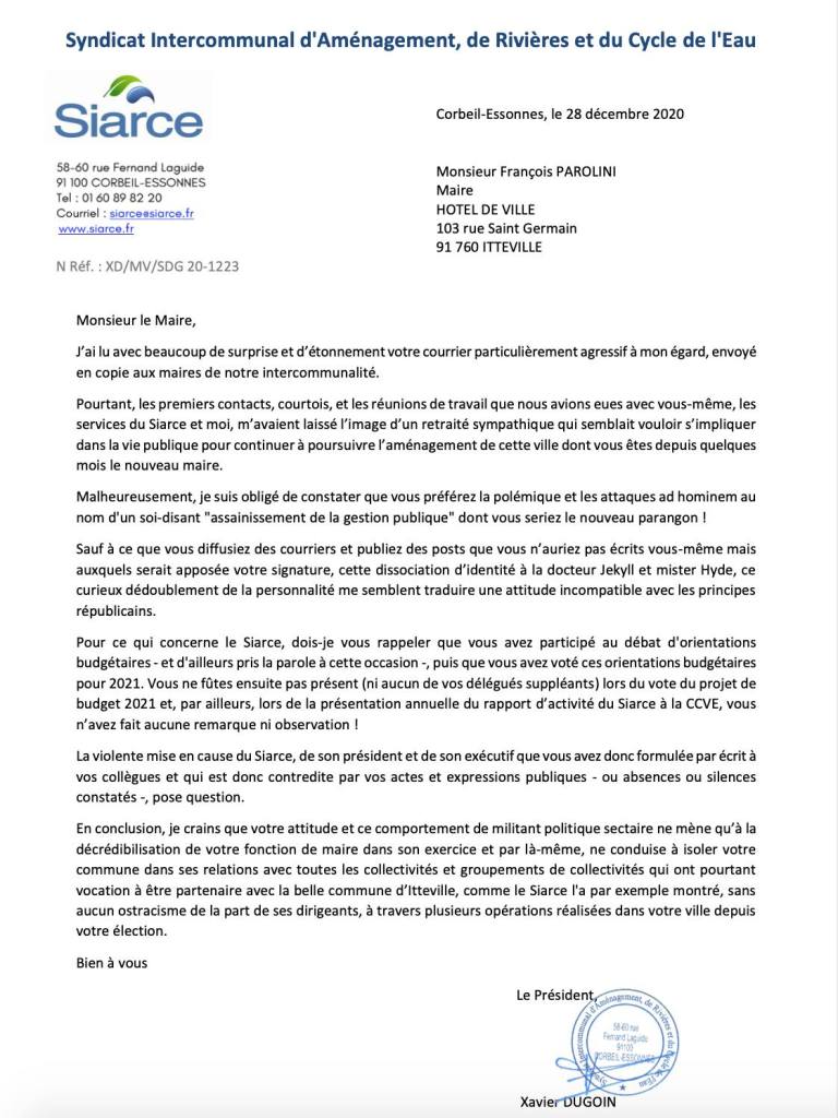 29 décembre 2020, 19:29 · Voici la lettre que m’adresse ce jour notre président du Siarce, Xavier Dugoin. Sur le fond nulle information. Mais que dire de la forme ! La colère est mauvaise conseillère. Mauvaise rédactrice, même quand on s’appuie sur son porte-plume de plus de 30 ans…Faut-il vous rappeler, monsieur le président le sens de votre fonction ?Vous avez été élu pour servir les maires et à ce titre vous nous devez des explications sur les dettes qui grèvent Siredom et Siarce. Je ne suis pas un sympathique retraité. Je n’ai pas été élu pour être sympathique et encore moins pour être retraité. En revanche me considérer comme tel en dit long sur la manière dont vous estimez le rôle des élus. Un sourire, quelques politesses et il faudrait accepter l’absence totale d’explication sur votre gestion calamiteuse. Vous me taxez de dédoublement de la personnalité. Je n’ai jamais autant été moi-même. Je tiens toujours la même ligne depuis des mois et vous le savez parfaitement, même quand je vous regarde droit dans les yeux en vous souriant. La duplicité est à chercher ailleurs : dans votre rapport aux élus. Rapport que vous qualifiez vous-même de courtois. Je n’attaque pas la personne, j’attaque la fonction dévoyée et les responsabilités non assumées. Je suis au service de mes concitoyens. Je suis là pour vous demander des comptes, que cela vous plaise ou non.