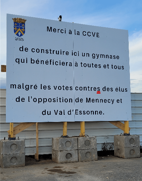 Texte envoyé » J’ai pu constater un grand panneau où la municipalité (vous aussi ! Étant adjoint au maire) dénonce à nos frais les votes contre des élus de l’opposition de Mennecy et du Val de l’Essonne !