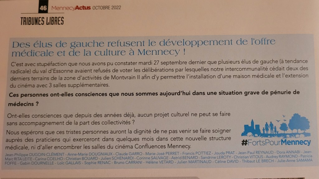 Monsieur le maire de Mennecy dans sa tribune du mois d’octobre entretient une confusion qu’il est nécessaire d’éclaircir.