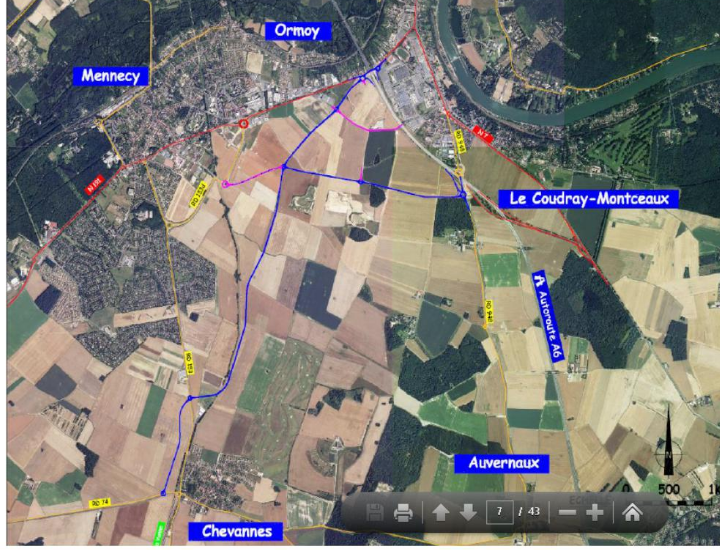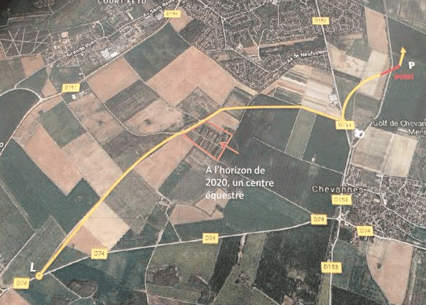 Le tracé de l’image ci-dessous a été proposé par la municipalité précédente de Chevannes en concertation avec les agriculteurs. Cette ligne jaune reprend les chemins actuels utilisés par les agriculteurs qui avec ce tracé ne perdraient plus qu’un mètre de chaque côté du chemin, une initiative intelligente. Le centre équestre prévu pour 2020 sur ce schéma est en fait, pour le moment, un dépôt de terres du Grand Paris mais des élus de Chevannes soupçonnent que les terres déposées soit polluées et d’origines incertaines.