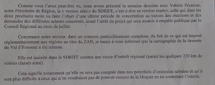 Le ZAN, Zéro Artificialisation Nette, nous laisserait penser que si 3 ha de terres agricoles disparaissent, trois hectares doivent être rendus à la nature mais qui en parle? Qui s’en soucie? Pourquoi la carte prévue n’apparaît-elle pas ni avec ce courrier ni dans le SDRIFE?