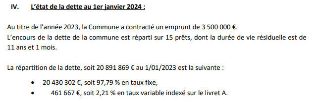 Après les 3 500 000€ empruntés en 2023, un emprunt supplémentaire de 3 600 000€ est prévu pour le budget 2024 en page 13. Nous en rembourserons à nouveau une partie et la différence s’ajoutera aux 28 445 280€ écrits dans le compte de gestion. Ainsi, chaque année, la dette de Mennecy augmente. Pourrions-nous envisager un budget à l’équilibre en 2024 en remboursant cet emprunt dans son intégralité?